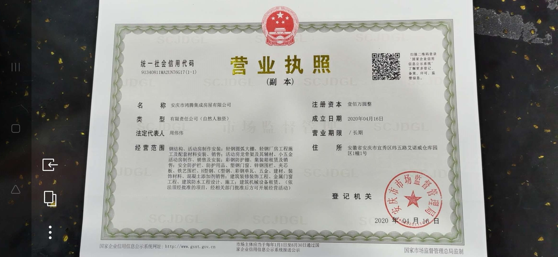 安慶市鴻騰集成房屋有限公司坐落于歷史文化名城-安徽省安慶市,公司地址位于安徽省安慶市宜秀區(qū)晉熙路8號(hào)(泰瑞達(dá)汽車(chē)鍛件有限公司1號(hào)廠(chǎng)房?jī)?nèi)),是一家集彩鋼板活動(dòng)房、新型活動(dòng)板房設(shè)計(jì)、制作、服務(wù)于一體的專(zhuān)業(yè)化企業(yè)。 公司成立于2020年,主要提供活動(dòng)板房、巖棉板、活動(dòng)板房鋼架,鋼結(jié)構(gòu)、圓弧大棚;活動(dòng)房龍骨架及其輔材、小五金活動(dòng)房制作、銷(xiāo)售;彩鋼防護(hù)棚、集裝箱租賃及銷(xiāo)售;安全防護(hù)欄、防護(hù)用品、塑鋼門(mén)窗、鋅...